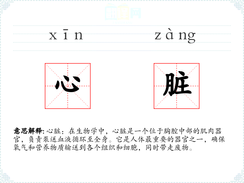 - 词源:心脏一词源自拉丁语“cor”,意为“心”,后来演变为古法语“cœur”和现代英语“heart”。