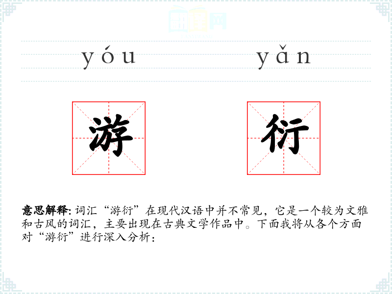 词汇“游衍”在现代汉语中并不常见,它是一个较为文雅和古风的词汇,主要出现在古典文学作品中。下面我将从各个方面对“游衍”进行深入分析: