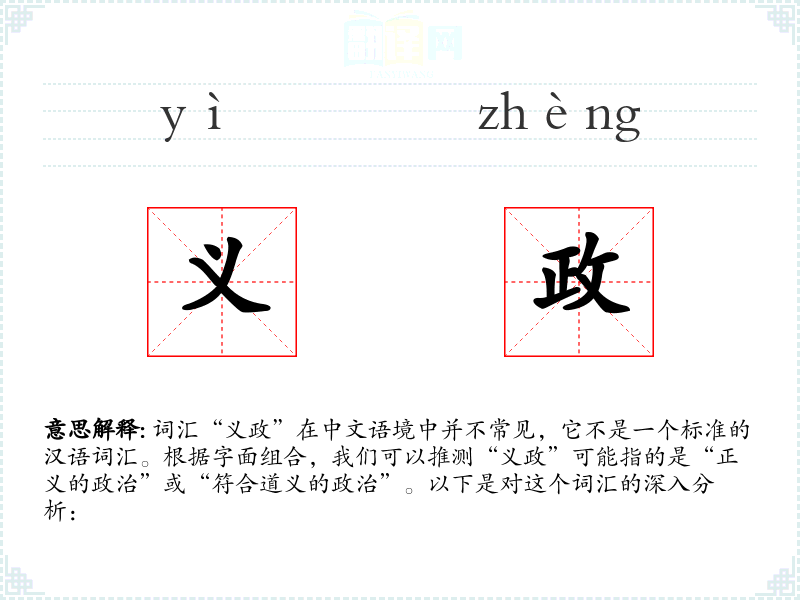 “义政”作为一个概念,强调了政治的道德性和正义性,是人们在讨论政治问题时的一个重要参考点。在语言学习和表达中,理解和运用这个词汇有助于深化对政治伦理和社会正义的认识。