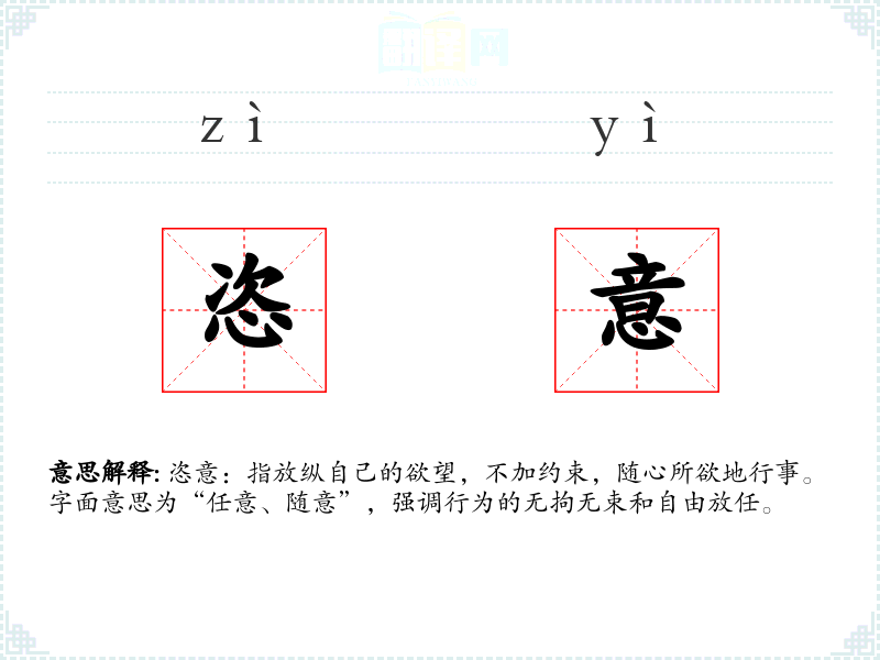 恣意:指放纵自己的欲望,不加约束,随心所欲地行事。字面意思为“任意、随意”,强调行为的无拘无束和自由放任。