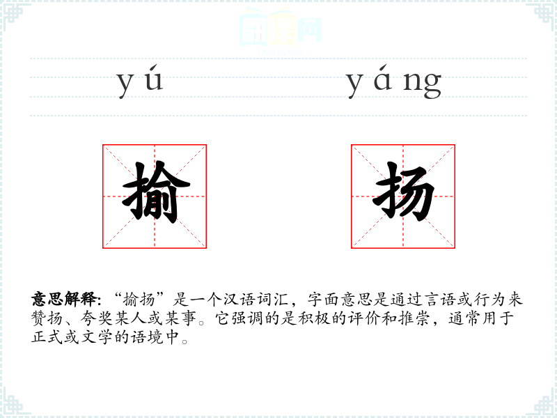 - 文学语境:在文学作品中,“揄扬”常用于描述对英雄人物或高尚行为的赞美,如“诗人揄扬了那位勇士的英勇事迹”。