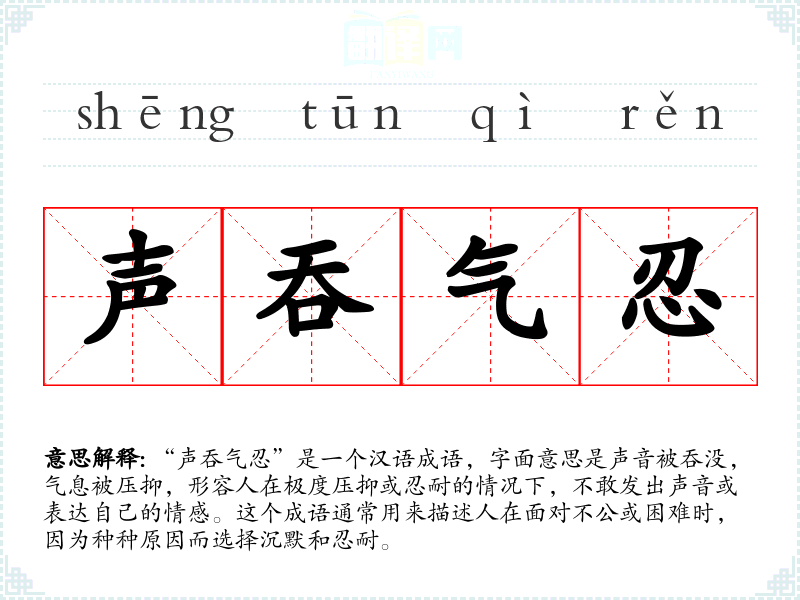 “声吞气忍”是一个汉语成语,字面意思是声音被吞没,气息被压抑,形容人在极度压抑或忍耐的情况下,不敢发出声音或表达自己的情感。这个成语通常用来描述人在面对不公或困难时,因为种种原因而选择沉默和忍耐。