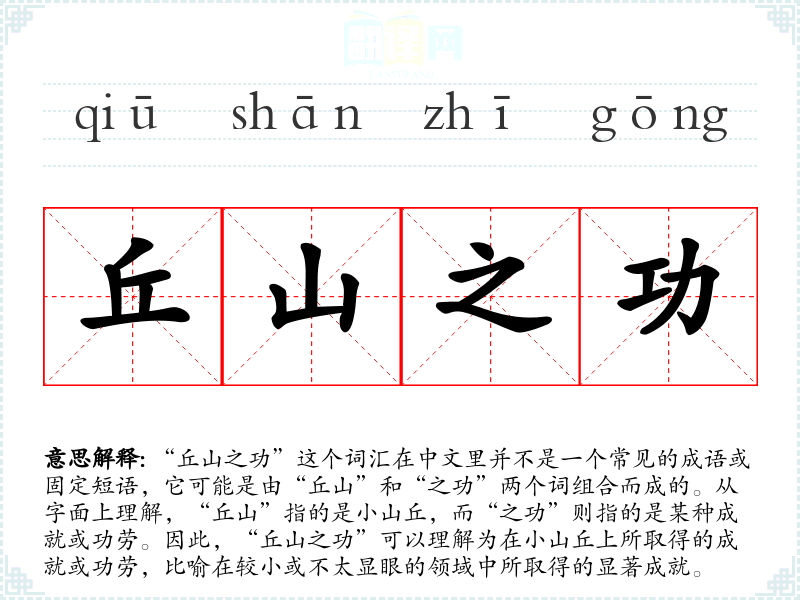由于“丘山之功”不是一个传统成语,它的词源和演变不太明确。它可能是现代汉语中由常用词汇组合而成的一个表达,用以形容在不太显眼的领域中所取得的成就。