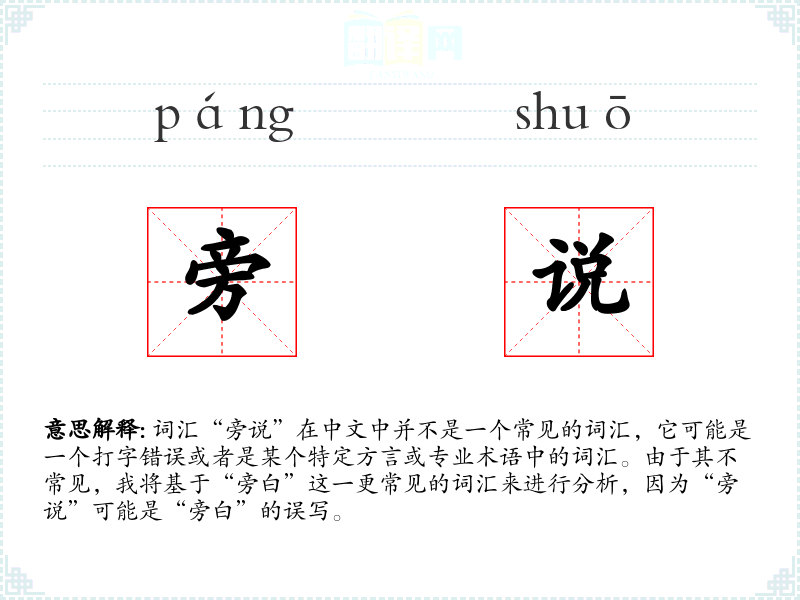 词汇“旁说”在中文中并不是一个常见的词汇,它可能是一个打字错误或者是某个特定方言或专业术语中的词汇。由于其不常见,我将基于“旁白”这一更常见的词汇来进行分析,因为“旁说”可能是“旁白”的误写。