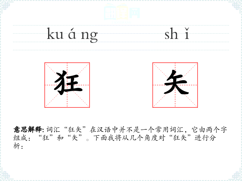 - 由于“狂矢”不是一个常用词汇,其词源和演变不太明确,可能是由“狂”和“矢”两个常用词汇组合而成的新词。