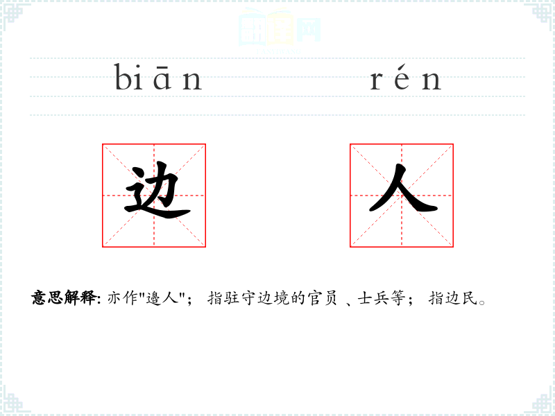 亦作"邉人"; 指驻守边境的官员﹑士兵等; 指边民。