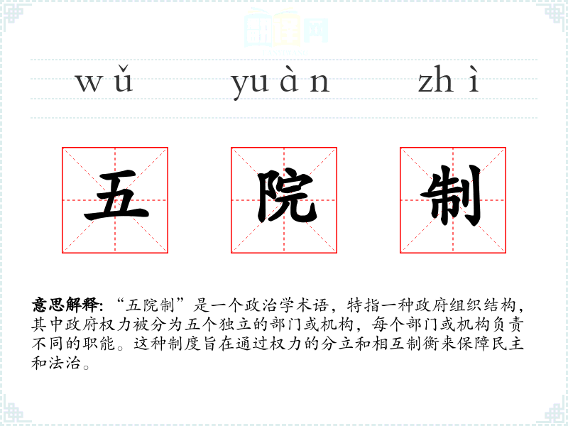 “五院制”这个词汇源自对政府结构的理论探讨,特别是在政治学和宪法学中。它的形成和发展与民主理论和实践紧密相关,尤其是在探讨如何通过制度设计来防止权力滥用和保障公民权利时。