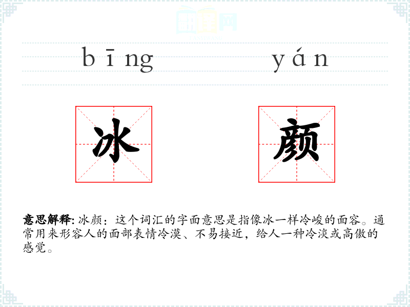 冰颜:这个词汇的字面意思是指像冰一样冷峻的面容。通常用来形容人的面部表情冷漠、不易接近,给人一种冷淡或高傲的感觉。