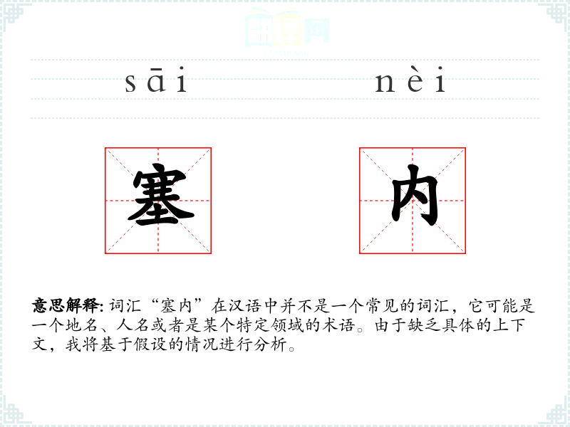 词汇“塞内”在汉语中并不是一个常见的词汇,它可能是一个地名、人名或者是某个特定领域的术语。由于缺乏具体的上下文,我将基于假设的情况进行分析。