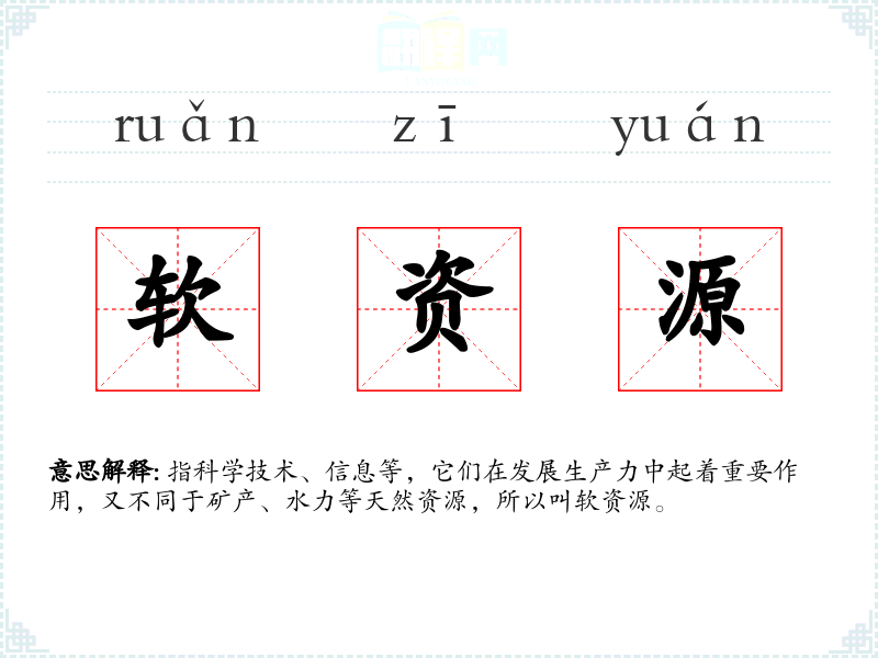 指科学技术、信息等,它们在发展生产力中起着重要作用,又不同于矿产、水力等天然资源,所以叫软资源。