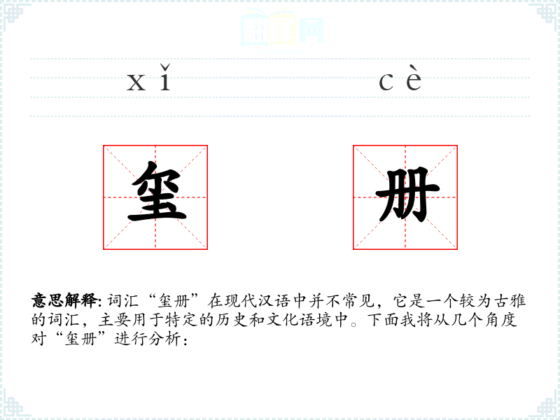 词汇“玺册”在现代汉语中并不常见,它是一个较为古雅的词汇,主要用于特定的历史和文化语境中。下面我将从几个角度对“玺册”进行分析:
