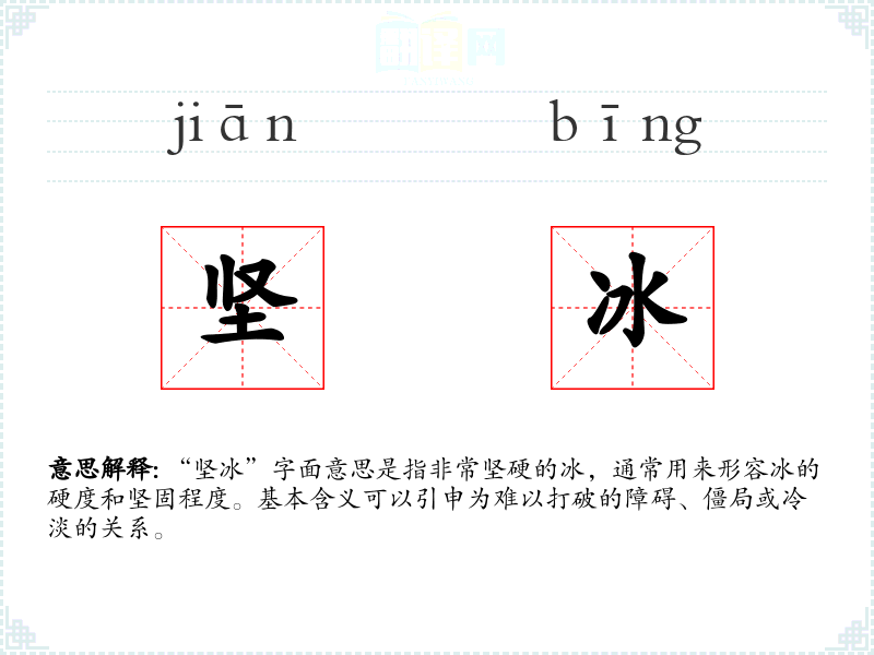 “坚冰”字面意思是指非常坚硬的冰,通常用来形容冰的硬度和坚固程度。基本含义可以引申为难以打破的障碍、僵局或冷淡的关系。
