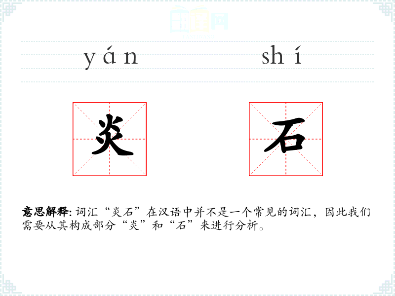 词汇“炎石”在汉语中并不是一个常见的词汇,因此我们需要从其构成部分“炎”和“石”来进行分析。
