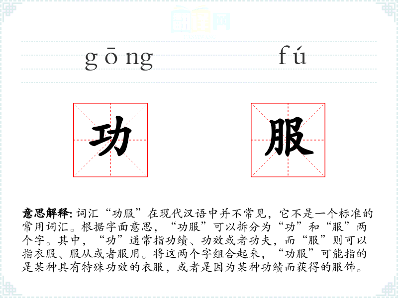 “功服”的字面意思可能是指具有特殊功效或象征意义的服装,或者是因为某种成就而特别设计的服装。