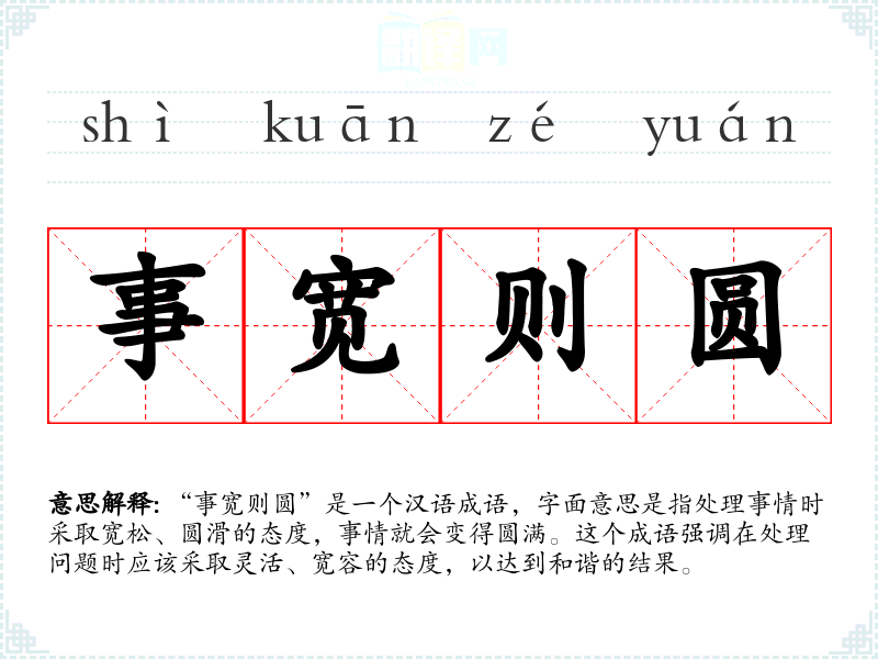 “事宽则圆”是一个汉语成语,字面意思是指处理事情时采取宽松、圆滑的态度,事情就会变得圆满。这个成语强调在处理问题时应该采取灵活、宽容的态度,以达到和谐的结果。
