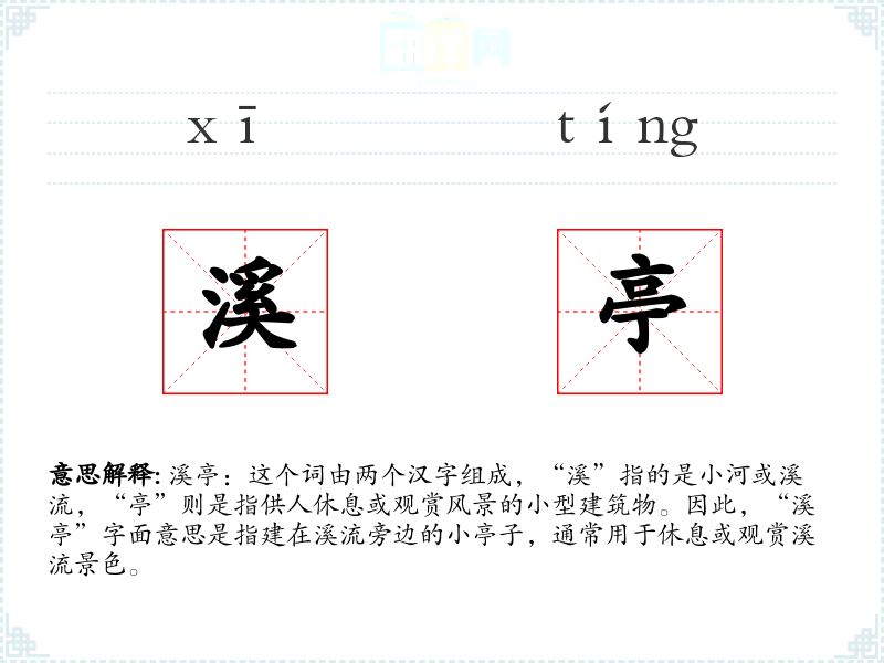 溪亭:这个词由两个汉字组成,“溪”指的是小河或溪流,“亭”则是指供人休息或观赏风景的小型建筑物。因此,“溪亭”字面意思是指建在溪流旁边的小亭子,通常用于休息或观赏溪流景色。