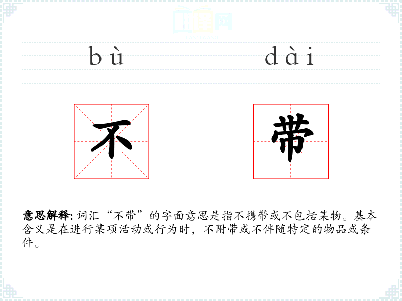 “不带”是由“不”和“带”两个字组成的复合词。在古代汉语中,“带”字原指腰带,后引申为携带的意思。随着语言的发展,“不带”逐渐固定为表示不携带某物的常用表达。