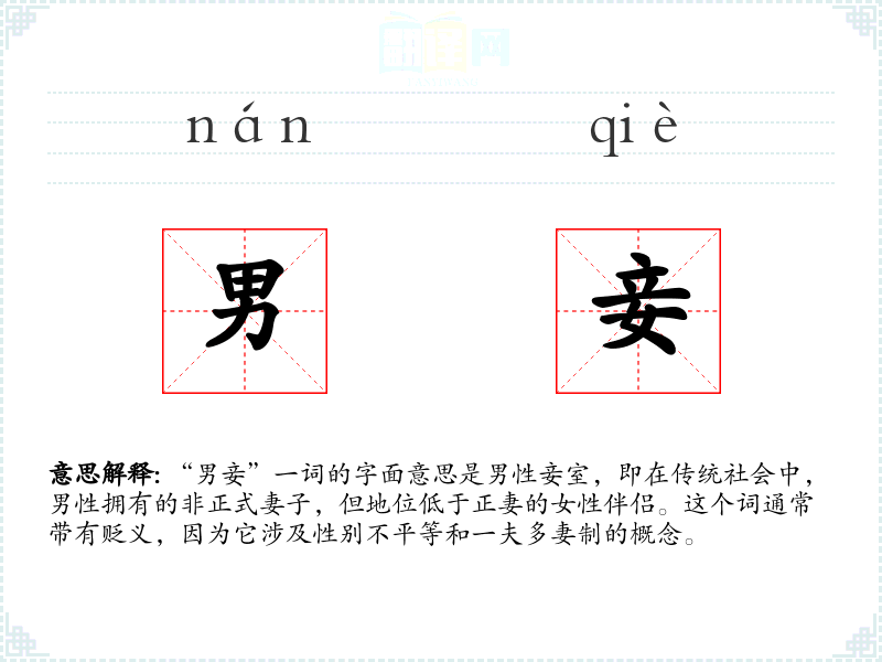 “男妾”一词的字面意思是男性妾室,即在传统社会中,男性拥有的非正式妻子,但地位低于正妻的女性伴侣。这个词通常带有贬义,因为它涉及性别不平等和一夫多妻制的概念。