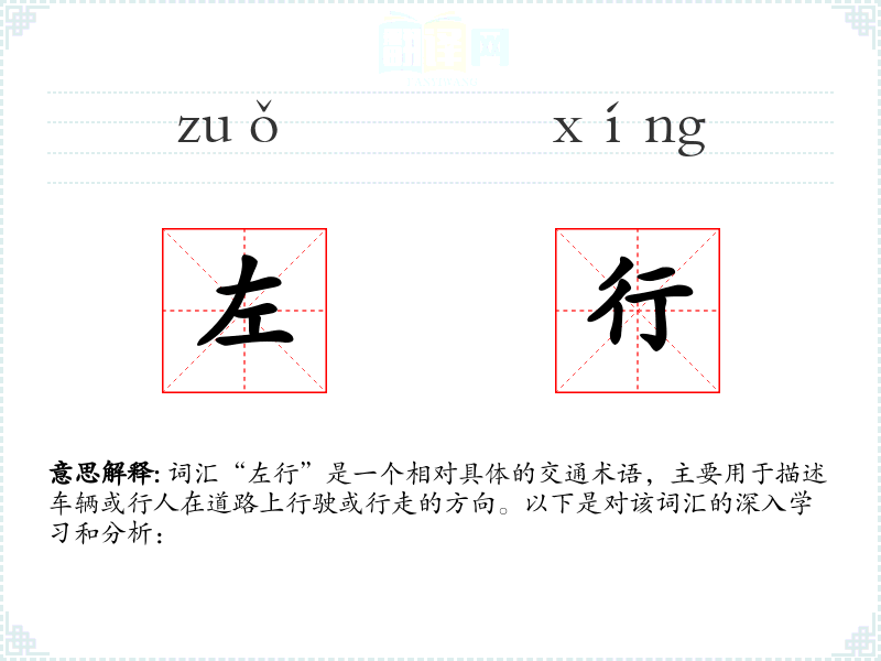 词汇“左行”是一个相对具体的交通术语,主要用于描述车辆或行人在道路上行驶或行走的方向。以下是对该词汇的深入学*和分析:
