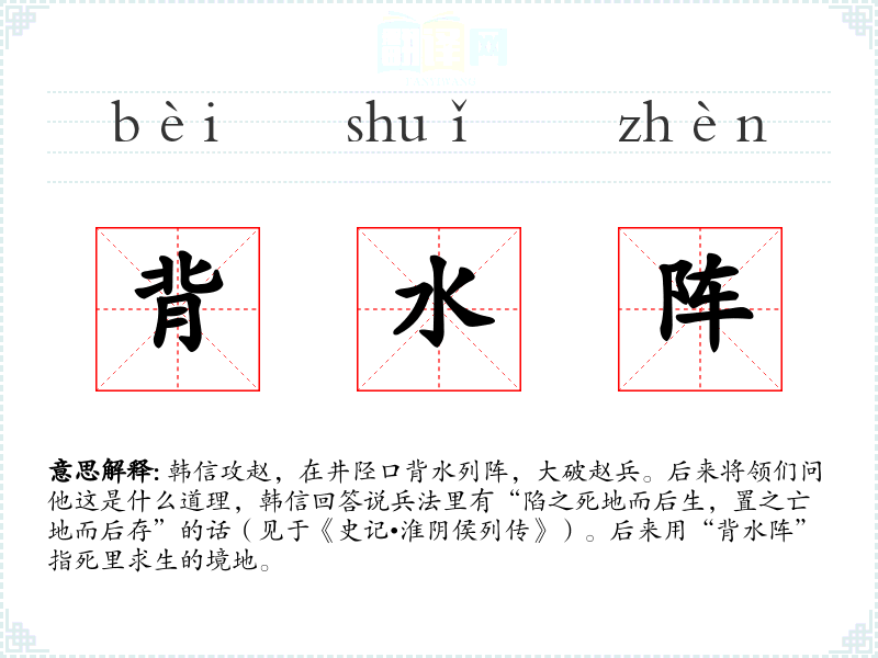 韩信攻赵,在井陉口背水列阵,大破赵兵。后来将领们问他这是什么道理,韩信回答说兵法里有“陷之死地而后生,置之亡地而后存”的话(见于《史记•淮阴侯列传》)。后来用“背水阵”指