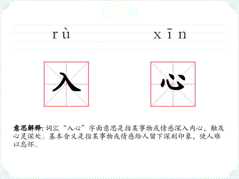 词汇“入心”字面意思是指某事物或情感深入内心,触及心灵深处。基本含义是指某事物或情感给人留下深刻印象,使人难以忘怀。