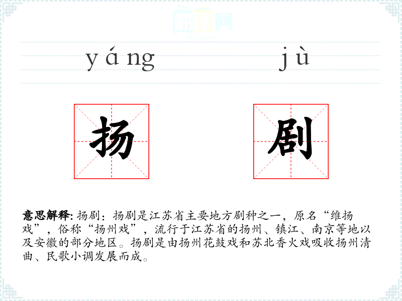 扬剧:扬剧是江苏省主要地方剧种之一,原名“维扬戏”,俗称“扬州戏”,流行于江苏省的扬州、镇江、南京等地以及安徽的部分地区。扬剧是由扬州花鼓戏和苏北香火戏吸收扬州清曲、民歌小调发展而成。