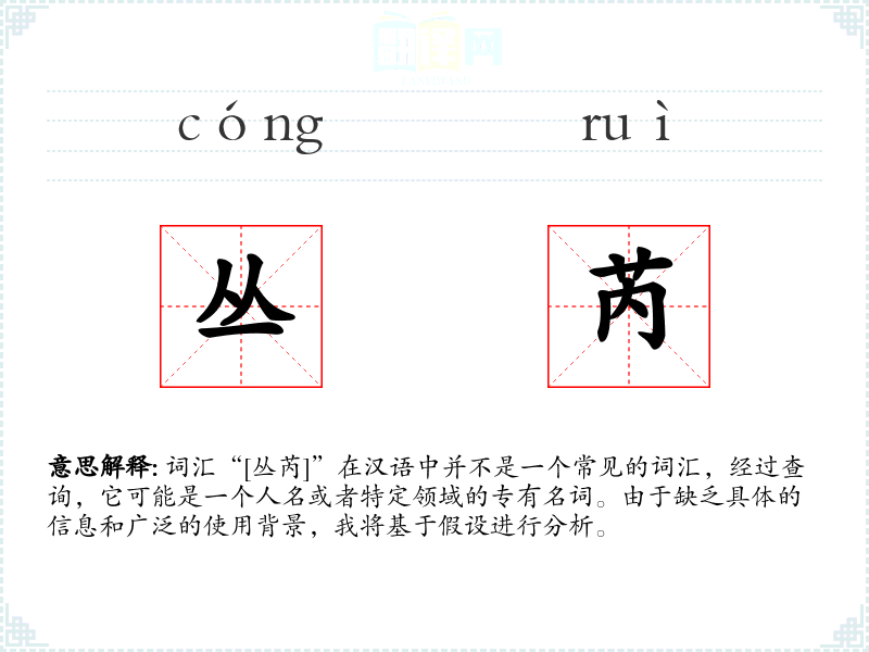 词汇“[丛芮]”在汉语中并不是一个常见的词汇,经过查询,它可能是一个人名或者特定领域的专有名词。由于缺乏具体的信息和广泛的使用背景,我将基于假设进行分析。