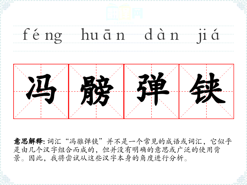词汇“冯骓弹铗”并不是一个常见的成语或词汇,它似乎是由几个汉字组合而成的,但并没有明确的意思或广泛的使用背景。因此,我将尝试从这些汉字本身的角度进行分析。