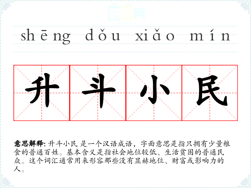 升斗小民 是一个汉语成语,字面意思是指只拥有少量粮食的普通百姓。基本含义是指社会地位较低、生活贫困的普通民众。这个词汇通常用来形容那些没有显赫地位、财富或影响力的人。