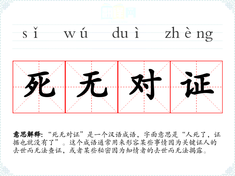 “死无对证”是一个汉语成语,字面意思是“人死了,证据也就没有了”。这个成语通常用来形容某些事情因为关键证人的去世而无法查证,或者某些秘密因为知情者的去世而无法揭露。