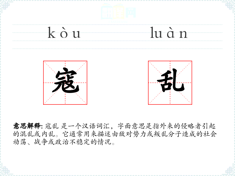 寇乱 是一个汉语词汇,字面意思是指外来的侵略者引起的混乱或内乱。它通常用来描述由敌对势力或叛乱分子造成的社会动荡、战争或政治不稳定的情况。