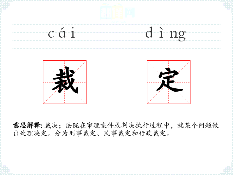 裁决;法院在审理案件或判决执行过程中,就某个问题做出处理决定。分为刑事裁定、民事裁定和行政裁定。