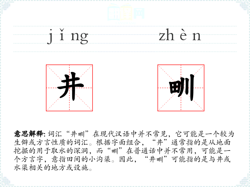 - 字面意思和基本含义:结合“井”和“甽”的含义,“井甽”可能指的是与水井或田间水渠相关的地方,具体含义可能需要根据方言或特定地区的使用习惯来确定。