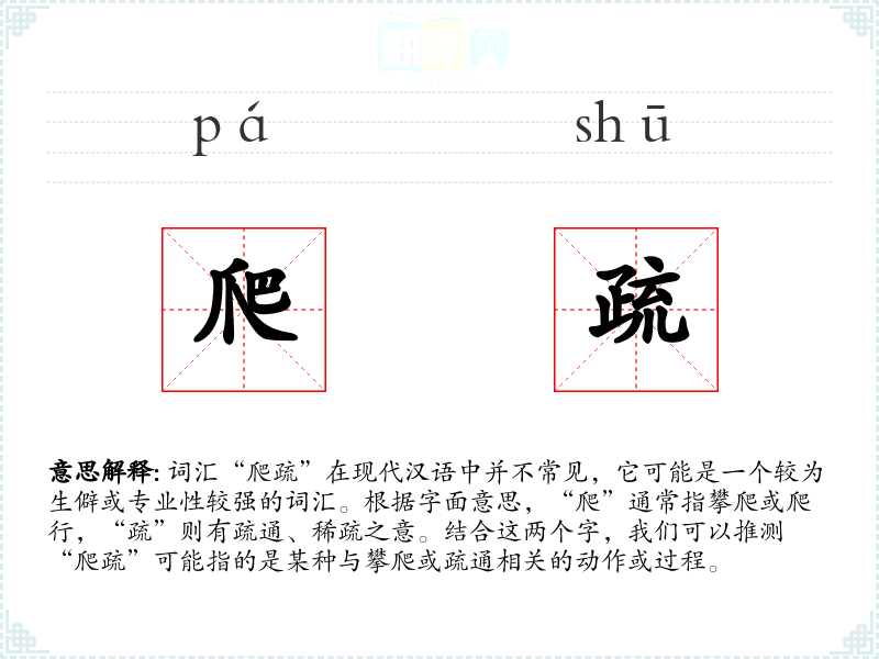 “爬疏”的字面意思可能是指通过攀爬的方式进行疏通或整理。然而,由于该词汇在日常语言中不常见,其确切含义可能需要结合具体的专业领域或文献来确定。