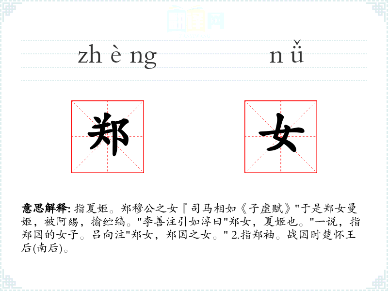 指夏姬。郑穆公之女『司马相如《子虚赋》"于是郑女曼姬,被阿緆,揄纻缟。"李善注引如淳曰"郑女,夏姬也。"一说,指郑国的女子。吕向注"郑女,郑国之女。" 2.指郑袖。战国时楚怀王后(南后)。