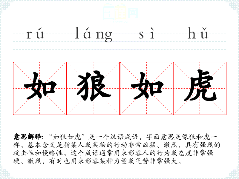 “如狼如虎”是一个汉语成语,字面意思是像狼和虎一样。基本含义是指某人或某物的行动非常凶猛、激烈,具有强烈的攻击性和侵略性。这个成语通常用来形容人的行为或态度非常强硬、激烈,有时也用来形容某种力量或气势非常强大。