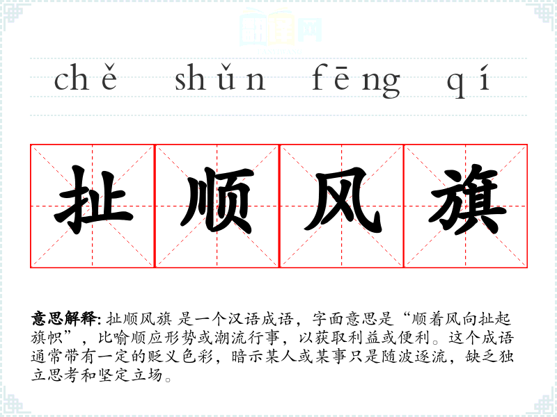 扯顺风旗 是一个汉语成语,字面意思是“顺着风向扯起旗帜”,比喻顺应形势或潮流行事,以获取利益或便利。这个成语通常带有一定的贬义色彩,暗示某人或某事只是随波逐流,缺乏独立思考和坚定立场。