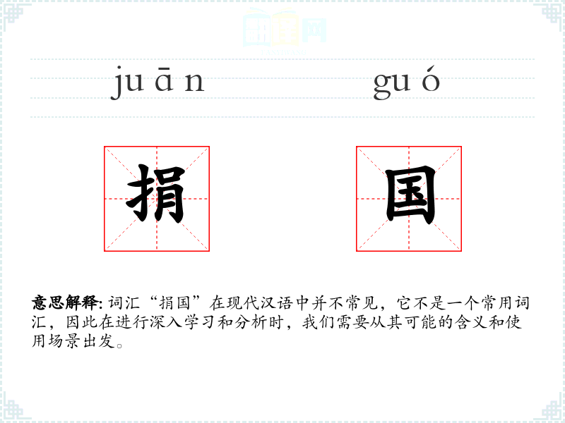 词汇“捐国”在现代汉语中并不常见,它不是一个常用词汇,因此在进行深入学习和分析时,我们需要从其可能的含义和使用场景出发。