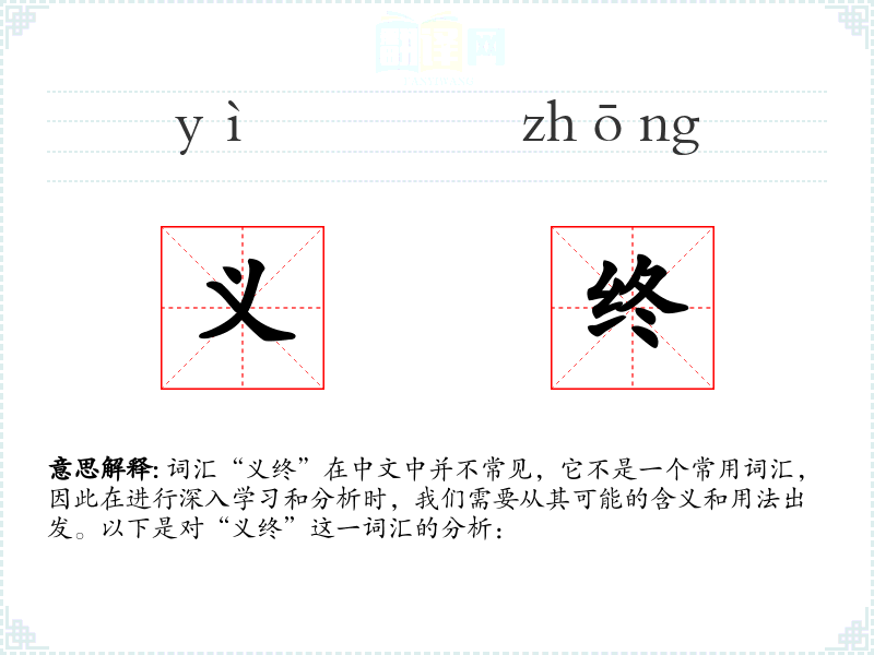 词汇“义终”在中文中并不常见,它不是一个常用词汇,因此在进行深入学*和分析时,我们需要从其可能的含义和用法出发。以下是对“义终”这一词汇的分析: