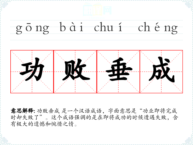 功败垂成 是一个汉语成语,字面意思是“功业即将完成时却失败了”。这个成语强调的是在即将成功的时候遭遇失败,含有极大的遗憾和惋惜之情。