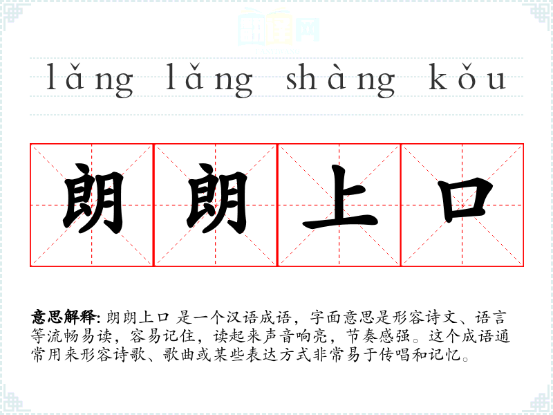 朗朗上口 是一个汉语成语,字面意思是形容诗文、语言等流畅易读,容易记住,读起来声音响亮,节奏感强。这个成语通常用来形容诗歌、歌曲或某些表达方式非常易于传唱和记忆。