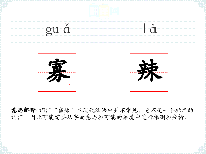 词汇“寡辣”在现代汉语中并不常见,它不是一个标准的词汇,因此可能需要从字面意思和可能的语境中进行推测和分析。