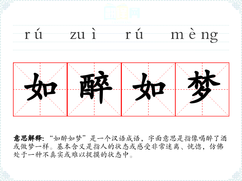 “如醉如梦”是一个汉语成语,字面意思是指像喝醉了酒或做梦一样。基本含义是指人的状态或感受非常迷离、恍惚,仿佛处于一种不真实或难以捉摸的状态中。