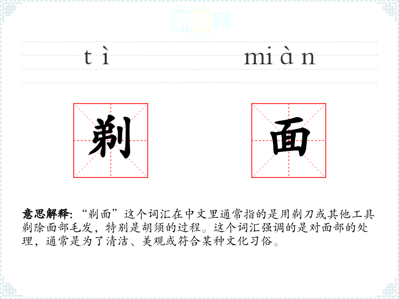 “剃面”这个词汇在中文里通常指的是用剃刀或其他工具剃除面部毛发,特别是胡须的过程。这个词汇强调的是对面部的处理,通常是为了清洁、美观或符合某种文化*俗。