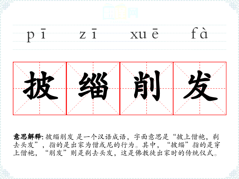 披缁削发 这个成语源自传统,特别是汉传。在中,出家是一种重要的行为,代表着个人对世俗生活的放弃和对精神生活的追求。这个成语在历史上被广泛使用,用以描述这一行为。