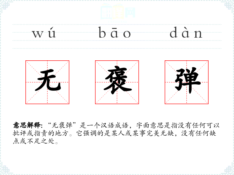 “无褒弹”是一个汉语成语,字面意思是指没有任何可以批评或指责的地方。它强调的是某人或某事完美无缺,没有任何缺点或不足之处。