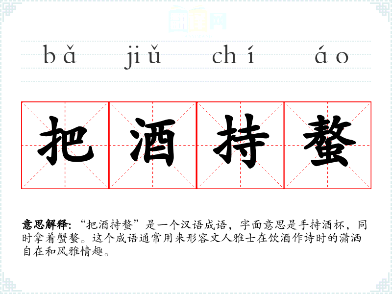 “把酒持螯”是一个汉语成语,字面意思是手持酒杯,同时拿着蟹螯。这个成语通常用来形容文人雅士在饮酒作诗时的潇洒自在和风雅情趣。