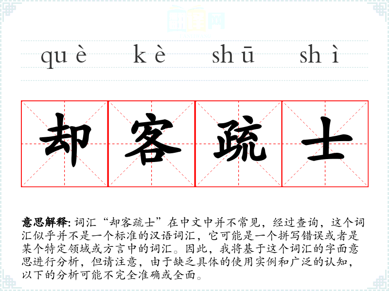 由于“却客疏士”不是一个标准词汇,对其的分析存在很大的不确定性。在语言学习和表达中,了解和使用标准词汇是非常重要的,这有助于确保沟通的准确性和有效性。如果遇到不熟悉的词汇,应当进行仔细的验证和研究。