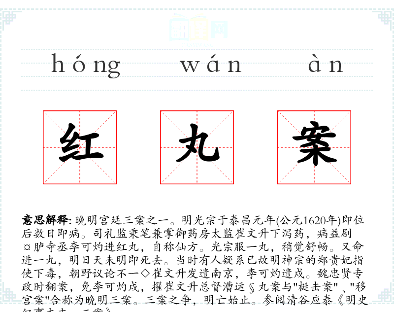 晩明宫廷三案之一。明光宗于泰昌元年(公元1620年)即位后数日即病。司礼监秉笔兼掌御药房太监崔文升下泻药,病益剧¤胪寺丞李可灼进红丸,自称仙方。光宗服一丸,稍觉舒畅。又命进一丸,明日天未明即死去。当时有人疑系已故明神宗的郑贵妃指使下毒,朝野议论不一◇崔文升发遣南京,李可灼遣戍。魏忠贤专政时翻案,免李可灼戍,擢崔文升总督漕运§丸案与"梃击案"﹑"移宫案"合称为晩明三案。三案之争,明亡始止。参阅清谷应泰《明史纪事本末.三案》。