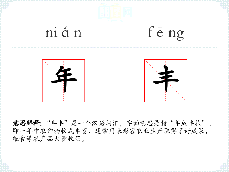 “年丰”这个词不仅反映了农业生产的成果,也承载了人们对美好生活的期待和对自然恩赐的感恩。在学*语言和表达时,理解这样的词汇有助于更深入地把握文化内涵和社会价值。